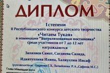 Башлангыч сыйныф укучыларының "Кояшкай" театр коллективы II Республикакулям "Тукайны укыйбыз" конкурсында I һәм III дәрәҗә Дипломнар белән бүләкләнделәр./ Театральный коллектив обучающихся начальных классов "Кояшкай" награжден дипломами первой и третьей степени Второго Республиканского конкурса детского творчества "Читаем Тукая".