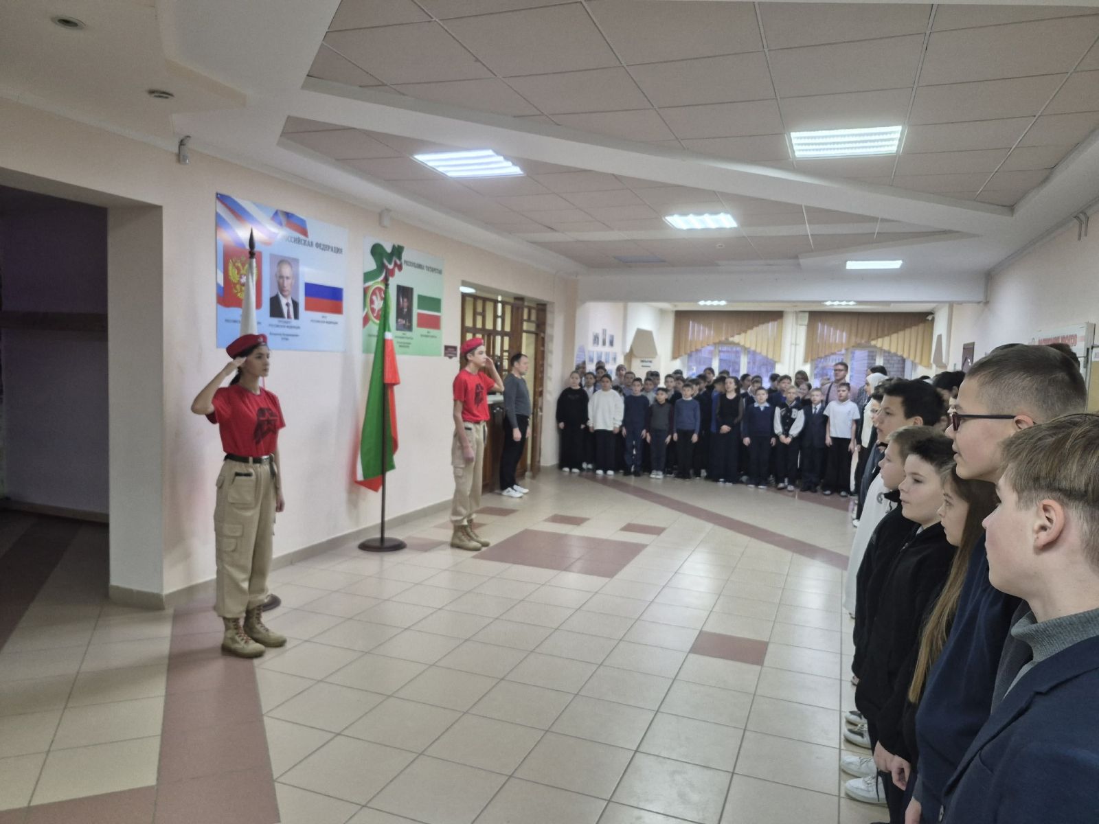 19 гыйнварда РФ һәм ТР гимннары башкарылган атналык линейка үтте. Анда 5-7 сыйныф укучылары катнашты. Яшь армиячеләр Гурьянова Милена һәм Дәүләтшин Гаделгә Россия Федерациясе һәм Татарстан Республикасы дәүләт флагларын күтәрү хокукы бирелде. Киләчәк уку атнасында илебез билгеләп үтәчәк дәүләт әһәмиятле даталары һәм вакыйгалары белән танышу булды. Мәктәп конкурсларында һәм акцияләрендә катнашучыларга грамоталар һәм дипломнар тапшырылды.