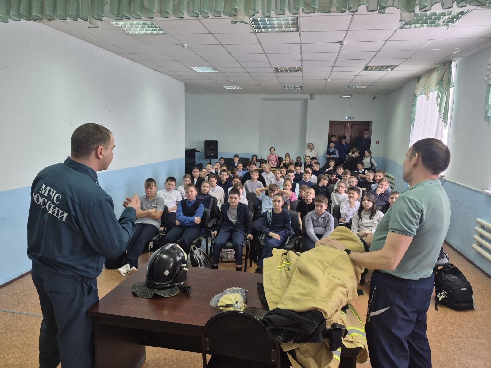 Сотрудник МЧС освежил знания о мерах пожарной безопасности в быту; напомнил номера вызова экстренных служб. В ходе встречи ребята померили боевую одежду пожарного. Урок прошёл в формате живого общения и у ребят была возможность задать вопросы.