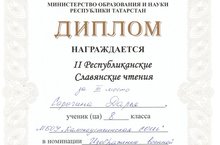 На IIРеспубликанских Славянских чтениях в номинации "Изображение военной тематики в декаратнивно-прикладном искусстве" Серёгина Дарья, ученица 8Б класса награждена дипломом 3 степени. Рукоаодитель Мингалиева А.Ф.