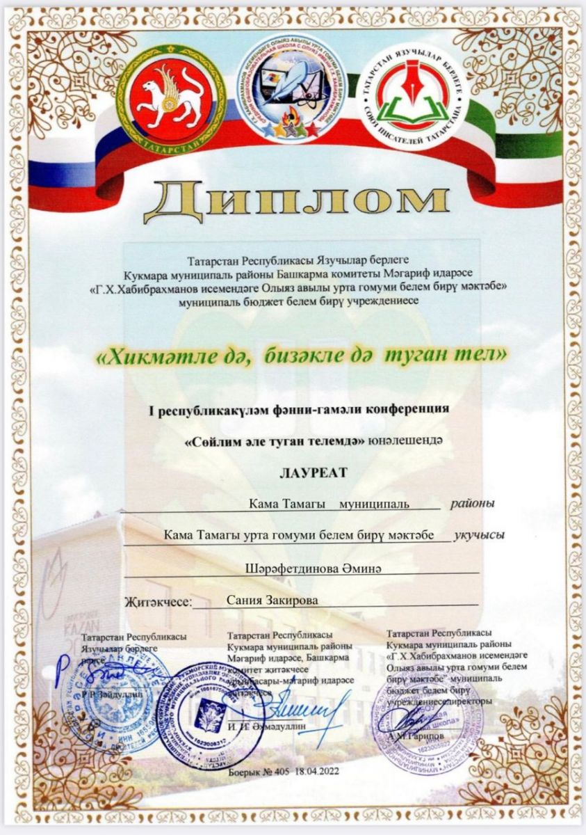 Кама Тамагы мәктәбенең 8 "А" сыйныфы укучысы Шәрәфетдинова Әминә Туган тел көненә багышланган республика конференциясендә катнашты. Шәрәфетдинова Әминә "Сөйлим әле туган телемдә"номинациясендә лауреат булды. Әминә һәм Сания Исмәгыйлевнаны котлыйбыз!