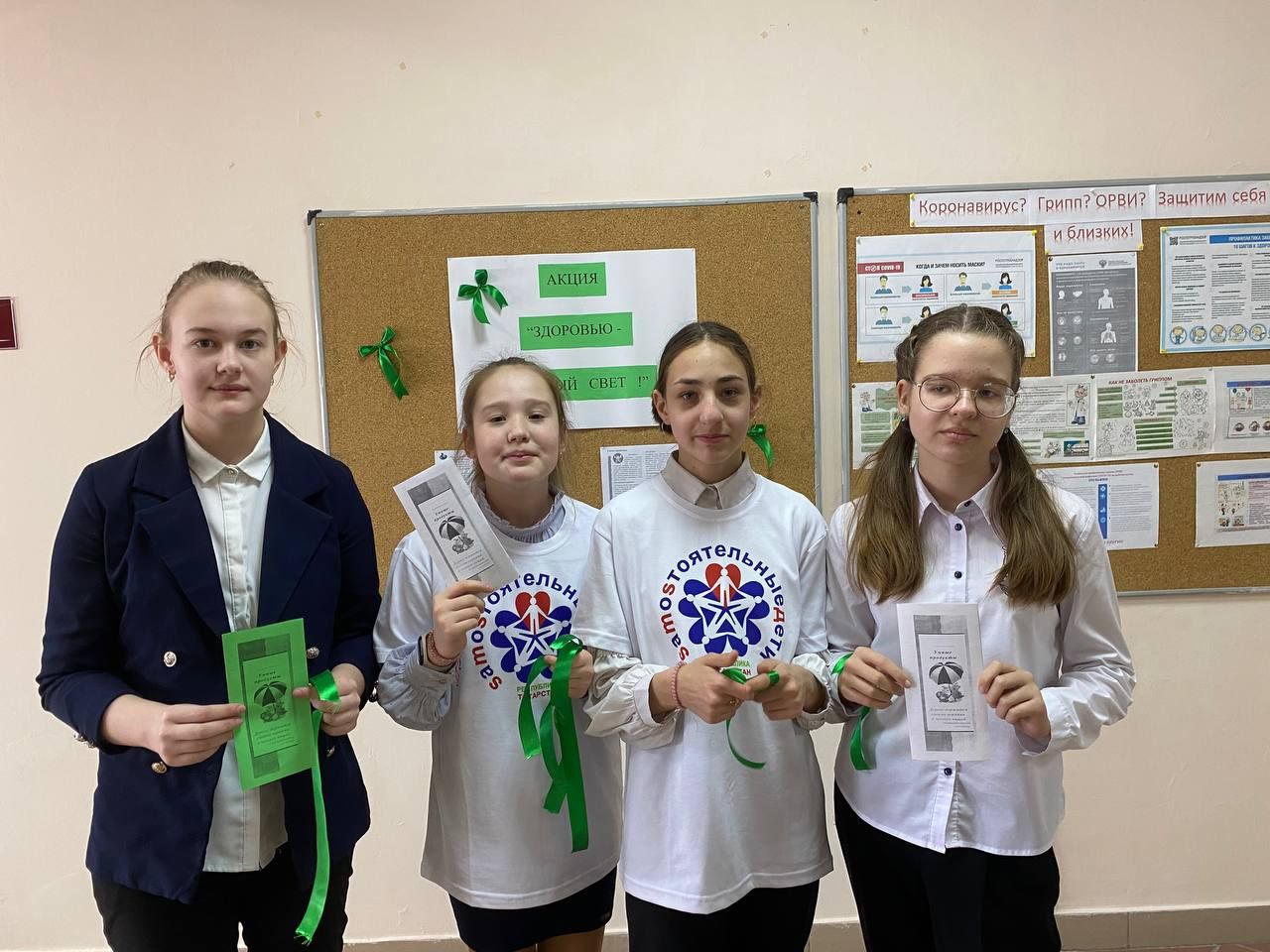 "Сәламәтлеккә - яшел төс" акциясе Кама Тамагы мәктәбендә "Үлем белән кайда сатуларын хәбәр ит" Бөтенроссия акциясе кысаларында узды. Sms балалар отряды активистлары Яшел тасманы бәйләргә тәкъдим иттеләр һәм катнашучыларга белешмәлек тапшырдылар: