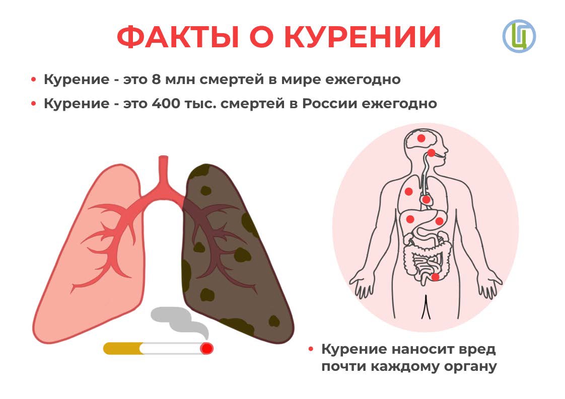 Согласно статистике, в России каждая 10-я женщина курит, а среди мужчин 50-60% заядлые курильщики, в некоторых социальных категориях эта цифра достигает 95%. Согласно данным ВОЗ курение является причиной 85% смертельных исходов от рака легких, бронхов, трахеи, 16% смертей от ишемической болезни сердца, 26% смертей от туберкулеза, 24% инфекций нижних дыхательных путей.