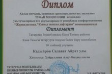Халык язучысы, күренекле драматург, җәмәгать эшлеклесе Туфан Миңнуллин исемендәге укытучыларның һәм укучыларның IV республика конференциясенең "Журналистика. Кызыл тышлы дәфтәрдән" номинациясендә 10 нчы сыйныф укучысы Кадыров Салават (җитәкчесе татар теле һәм әдәбияты укытучысы Хәйруллина А.Ф.) дипломант булды. Котлыйбыз!