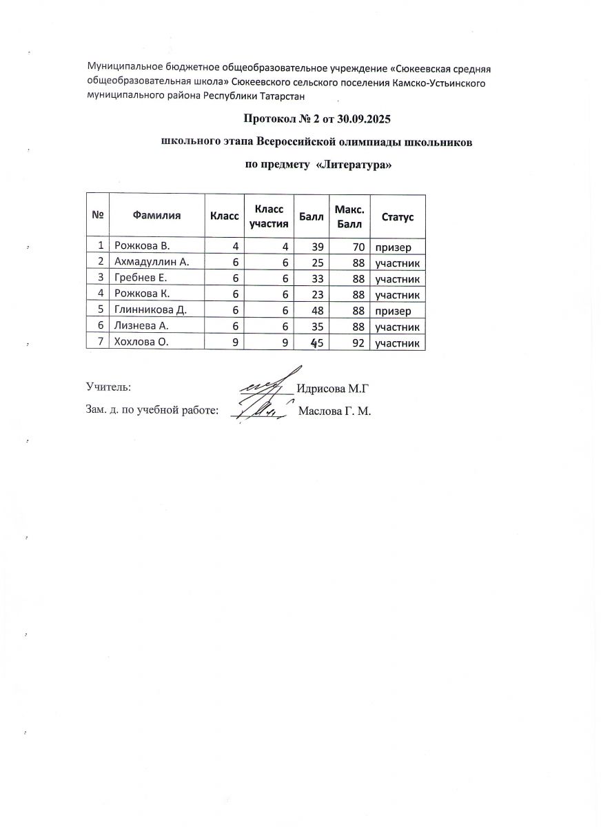 2) Протокол школьного этапа Республиканской олимпиады по предмету