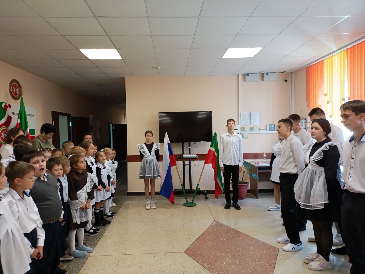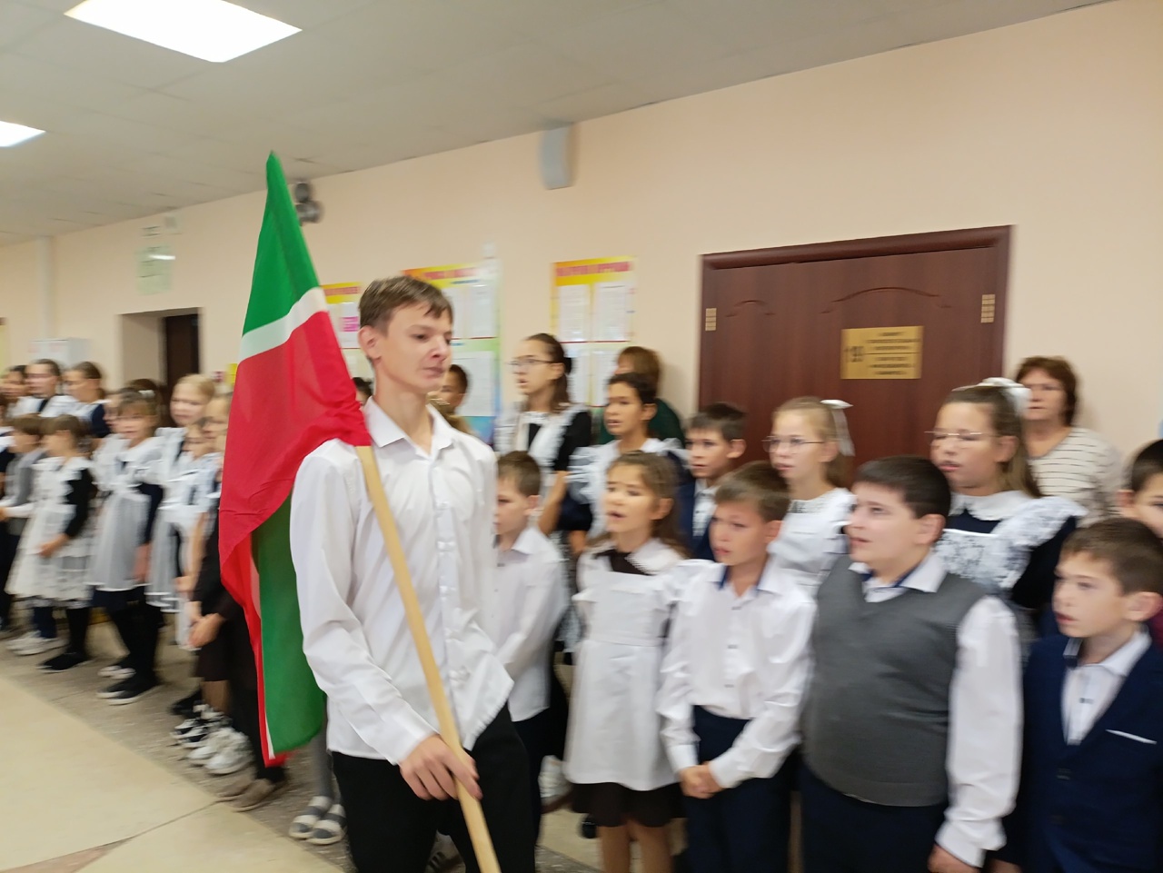 Учебная неделя началась с торжественного выноса флагов и исполнения гимнов Российской Федерации и Республики Татарстан.