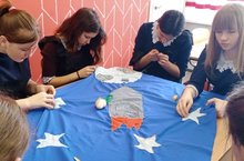 Обучающиеся 8 класса, вместе с классным руководителем Савичевой М. В. приняли участие в акции "Космос рядом", которая прошла под названием " Звездное небо", где ребята должны были отобразить на материале фрагмент на космическую тематику