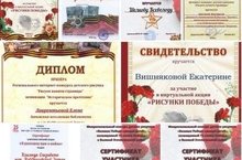 В течении всего времени подготовки к празднованию Великой Победы, наши ребята приняли участие в различных конкурсах рисунков и поделок, за которые получили дипломы, грамоты и сертификаты. Поздравляем победителей!