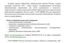 Уважаемые родители! В рамках проекта Образование «Национальные проекты России», службы поддержки родителей «Әти - әнием ярдәме» государственным автономным образовательным учреждением для детей, нуждающихся в психолого-педагогической и медико-социальной помощи «Центр психолого-педагогической реабилитации и коррекции «Росток» (далее - ГАОУ ЦППРК «Росток») проводятся бесплатные психологические консультации для родителей Республики Татарстан очно и в онлайн формате.