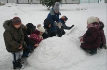 Ура! Вот и долгожданный снежок! Дети лепят снежные скульптуры для украшения территории школы к Новому году.