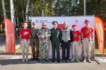 Юнармейцы отряда имени Героя Советского Союза А. Е. Кошкина Большеподберезинской школы на военно- спортивных играх в Казанском танковом училище. Фото с начальником Республиканского центра "Юнармия" - генерал - майором А. И. Бородиным.