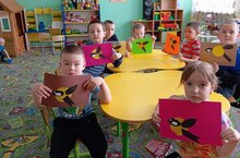 Балалар кисеп- ябыштыру шөгылендә төсле кәгазьләрдән кошлар ясадылар. Шөгыльнең максаты: тирә-ягыбызда яшәүче кошларны тану, безнең якта кышлаучы кошларның атамаларын истә калдыру, кышкы суык чорда кошларга ярдәм итү хисләре тәрбияләү.