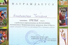 Грамоту получила и ученица третьего класса Анисимова Татьяна. Она заняла третье место по плаванию в своей возрастной категории.Соревнования были посвящены международному женскому дню 8 марта. Молодцы! Так держать! -