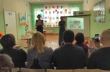У нас учат: | 11 учителей/11укытучы; 2 воспитателя/2 тәрбияче |
