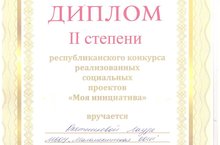 Победа на республиканском конкурсе 22.05.2017 Ученица 9 класса, Охотникова Л. участвовала в республиканском конкурсе реализованных социальных проектов "Моя инициатива" с проектом "Школьный сад" (руководитель Шихова М.С.) и удостоилась Диплома 2 степени. Молодец, Лаура! Желаем тебе дальнейших успехов!