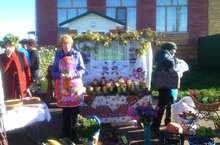 Вчера прошла ярмарка школьной продукции в районном центре. Выставка состояла из разных овощей, разносолов, пирогов и чаепитии. Девочки выступили с номером перед посетителями ярмарки.