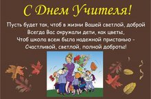 День учителя 05.10.2016 Листочки в вальсе кружатся, У школы листопад. Сверкает солнце в лужицах, Улыбки у ребят. Поздравляют все ребята В этот день осенний: С праздником учителя! Счастья Вам, веселья! Спасибо Вам за все труды, За то, что рядом вы всегда, А в сердце вашем доброты Не станет меньше никогда