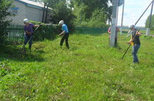 Каждый год в это время весь коллектив педагогов и работников школы выходят на покос травы на пришкольном участке и вокруг него. Участок большой 1,5 га. Силы тоже нужны немалые.