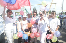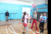 В школе несмолкает ребячий смех. Дети под руководством Козина Сергея Ивановича проводят веселые игры. Например волейбол с шарами.