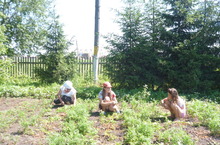 Капуста каждый год радует нас богатым урожаем. И нынче она сразу принялась в ход. Но надо ее освободить от сорняков над этим и трудятся девочки.