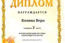 3 место по самбо 16.11.2017 Сегодня три ученика нашей Козина В.,Шиварова А. и Давыдов Д. участвовали в кубке федерации по самбо РТ. И Козина В. заняла 3 место в весовой категории до 34 кг. Ее наградили сертификатом на получение спортивной формы. Молодец! Желаем дальнейших успехов!