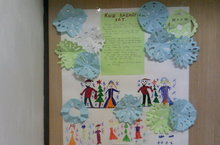 Дети старшей группы написали письмо Деду Морозу.Из цветной бумаги вырезали снежинки, нарисовали Дедушку Мороза.Воспитатель все это приклеила на ватман и повесили в группе.