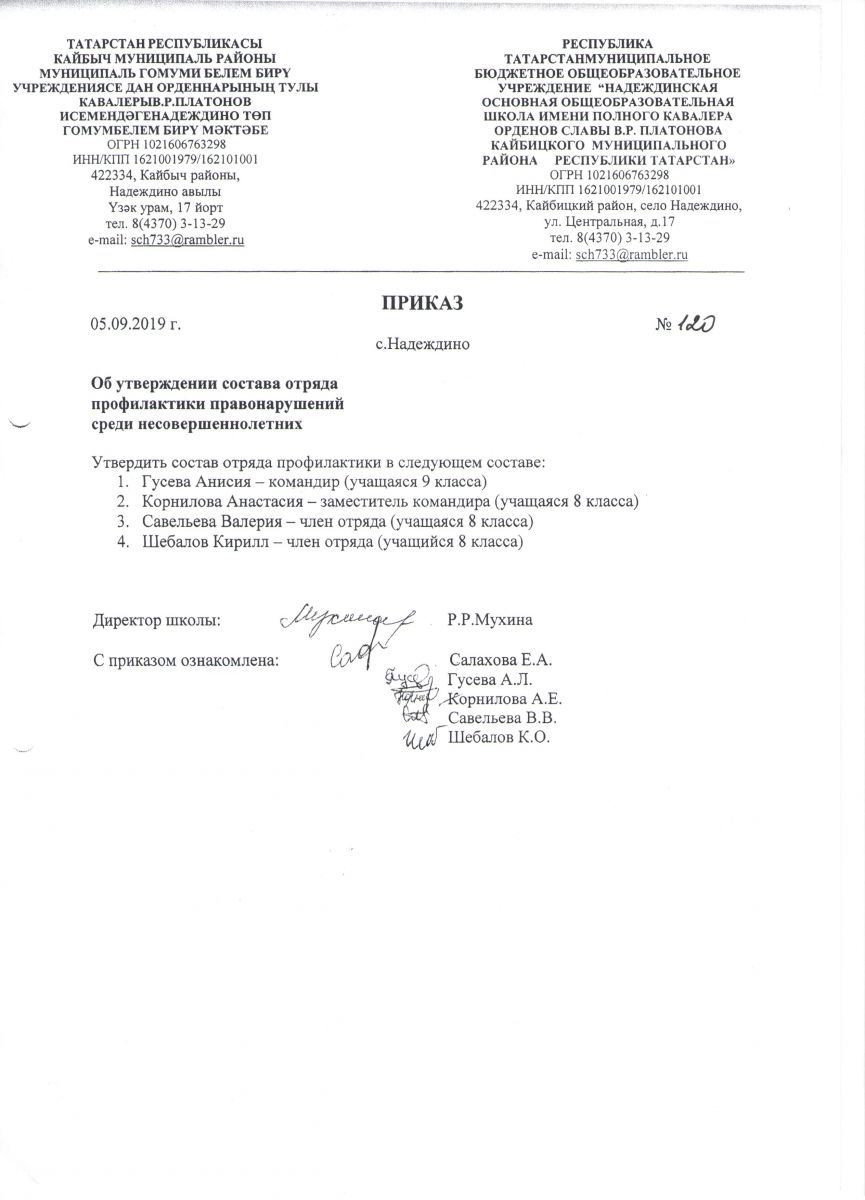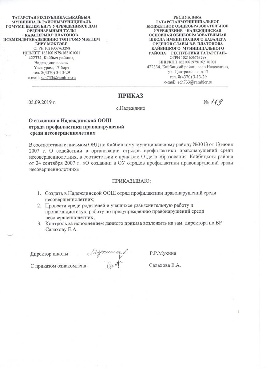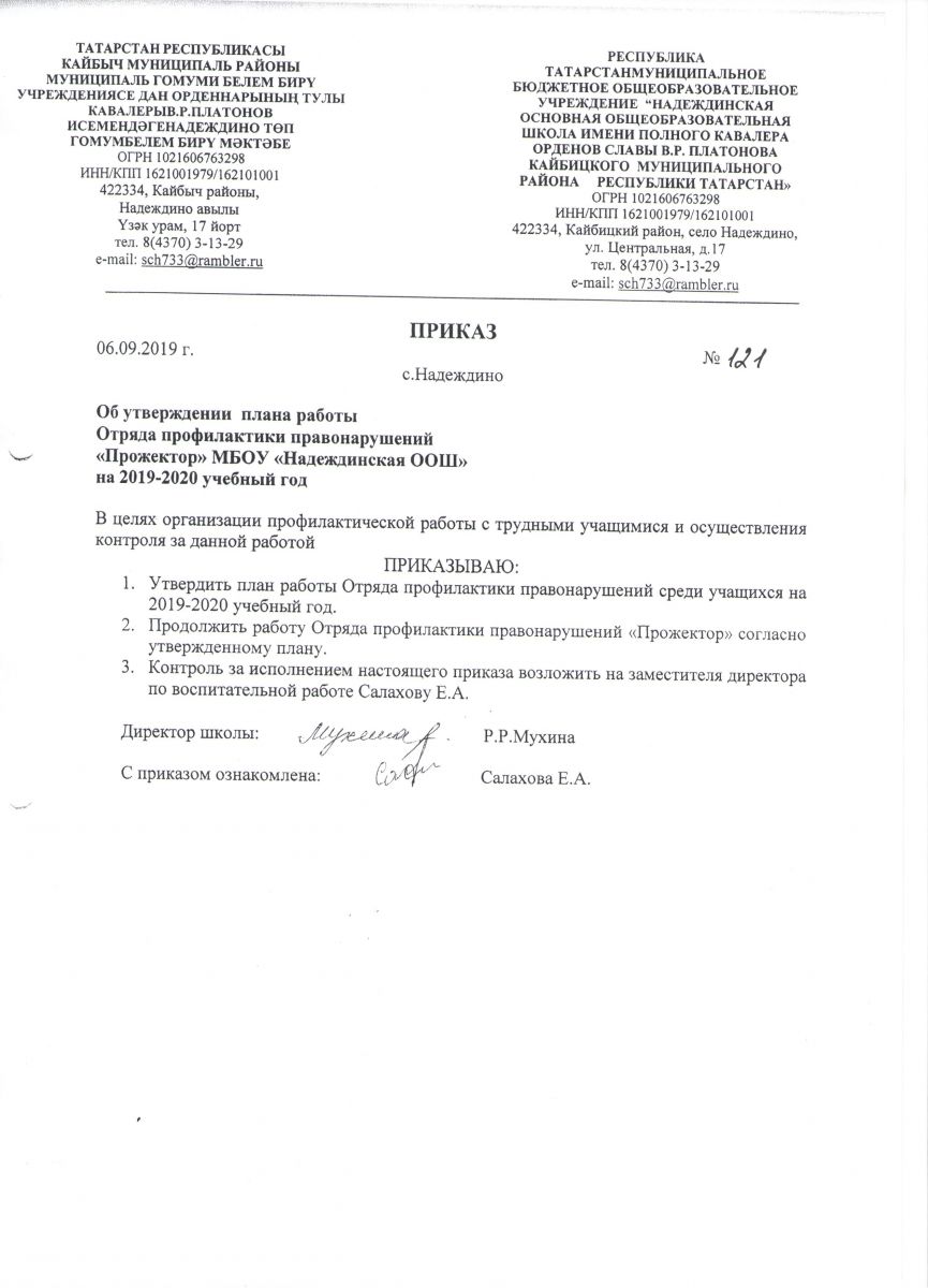 Приказ об утверждении плана работы отряда профилактики правонарушений