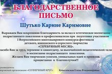 За вклад в эстетическое воспитание подрастающего поколения и профессионализм при подготовке участников 1 Всероссийского многожанрового конкурса -фестиваля детского,юношеского и взрослого творчества "СЕРЕБРЯНЫЙ МЕСЯЦ", преподаватель отделения "Вокал" Шутько Карина Каримовна была награждена благодарственным письмом.