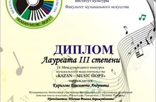 Учащиеся школы приняли участие в IV Международном конкурсе музыкального исполнительства «KAZAN – MUSIC ЙОРТ» и удостоились призовых мест: ученики отделения "Вокал" - Кирилова Елизавета - Лауреат III степени в номинации "Эстрадный вокал" (преподаватель Тлепова Р.А.); Макарв Никита - Дипломант I степени в номинации "Эстрадный вокал" (преподаватель ШутькоК.К.); ученики отделения "Народные инструменты (баян)" - Багавиев Ильфат - Дипломант II степени, Рахматуллин Ислам - Дипломант III степени, Аскраов Ранис - Дипломант III степени, Зиятдинова Адиля -Дипломант III степени (преподаватель Яруллина З.М.). Организатором конкурса является ФГБОУ ВО "Казанский государственный институт культуры". Поздравляем наших призёров с успехом и желаем дальнеших творческих полётов!
