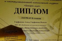 2 декабря в Детской школе искусств Приволжского района г.Казани прошел III Республиканский конкурс-фестиваль вокальной и инструментальной классической музыки “Sempre vivo”. В конкурсе приняли участие учащиеся Кайбицкой детской школы искусств сестры Гирфановы Назиля и Азиза. Во II возрастной группе (9-10 лет) в номинации «Инструментальные ансамбли» девочки награждены Дипломом Лауреата II степени. За большой личный вклад в развитие культуры и сохранение традиций классической музыки преподавателю Хисамовой Р.М. вручили Благодарственное письмо.