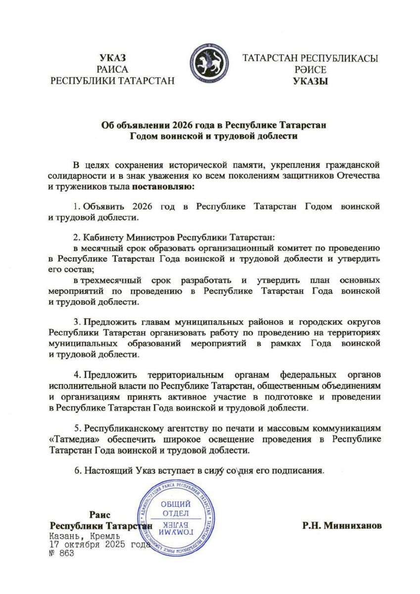 Указ Президента Республики Татарстан от 27 сентября 2024 №748 " Об объявлении2025 года В Республике Татарстан Годом защитника Отечества" https://pravo.tatarstan.ru/president/ukaz.htm?npa_id=1469626
