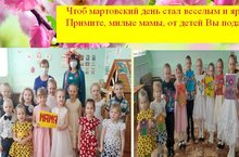 В детском садике «Солнышко» прошёл праздник, посвящённый Международному дню 8 марта. В гости к детям приходила Весна. Для мам, бабушек и Весны дети читали стихи, пели песни, танцевали. Вместе с Весной играли в весёлые игры. Весь праздник был снят на видео и отправлен родителям. Мамам дети подарили подарки, сделанные своими руками.