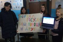 Учащиеся 10 э класса, в рамках республиканской акции "Весеняя неделя добра" провели акцию "Доброволец в центре информации". Задачи акции : формирование интереса у граждан в необходимости получения подтвержденной учетной записи ЕСИА; популяризация электронных услуг.