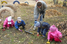 Вот как малыши стараются! Важно, во время прогулки, привлечь детей к посильным поручениям (собрать листочки, шишки, игрушки и др.)