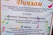 Поздравляем Якимову Татьяну Александровну, занявшую 2 место в районном конкурсе "Симфония мастерства" в номинации "Мастер-класс на тему:"Познавательно-игровая программа для детей с ОВЗ "Цирковая школа клоуна Гоши"