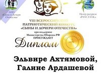 ПОЗДРАВЛЯЕМ ПОБЕДИТЕЛЕЙ VIII Всероссийского патриотического конкурса "СЫНЫ И ДОЧЕРИ ОТЕЧЕСТВА" преподавателей школы АХТЯМОВУ ЭЛЬВИРУ ОЛЕГОВНУ И АРДАШЕВУ ГАЛИНУ СЕРГЕЕВНУ!!!