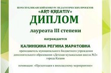ПОЗДРАВЛЯЕМ КАЛИНКИНУ РЕГИНУ МАРАТОВНУ-ЛАУРЕАТА 3 СТЕПЕНИ III РЕСПУБЛИКАНСКОГО КОНКУРСА ПЕДАГОГИЧЕСКИХ ПРОЕКТОВ "ART-KREATIV".