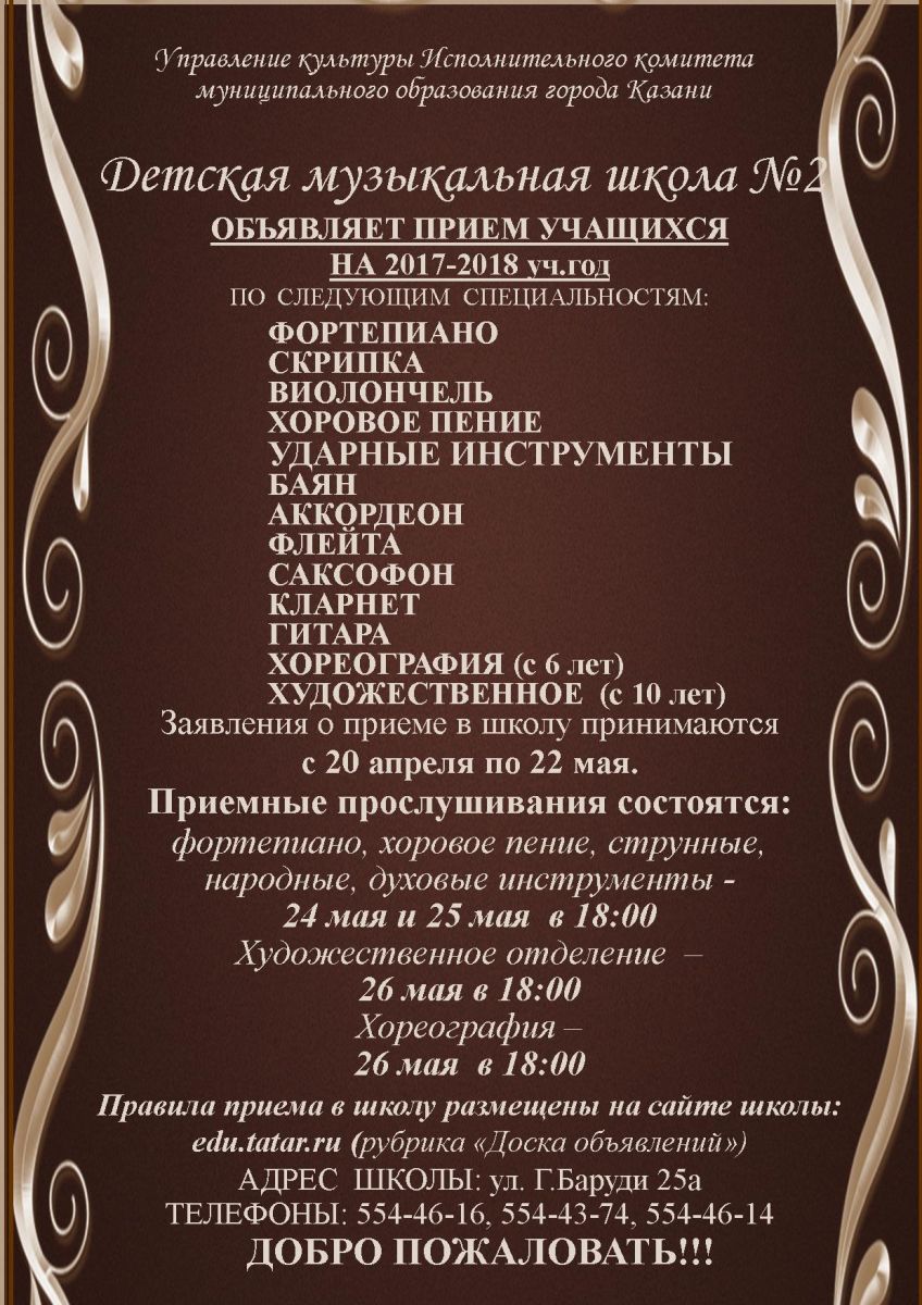 Опубликовано: 09.06.2017Детская музыкальная школа №2 объявляет прием учащихся на 2017-2018 учебный год!
