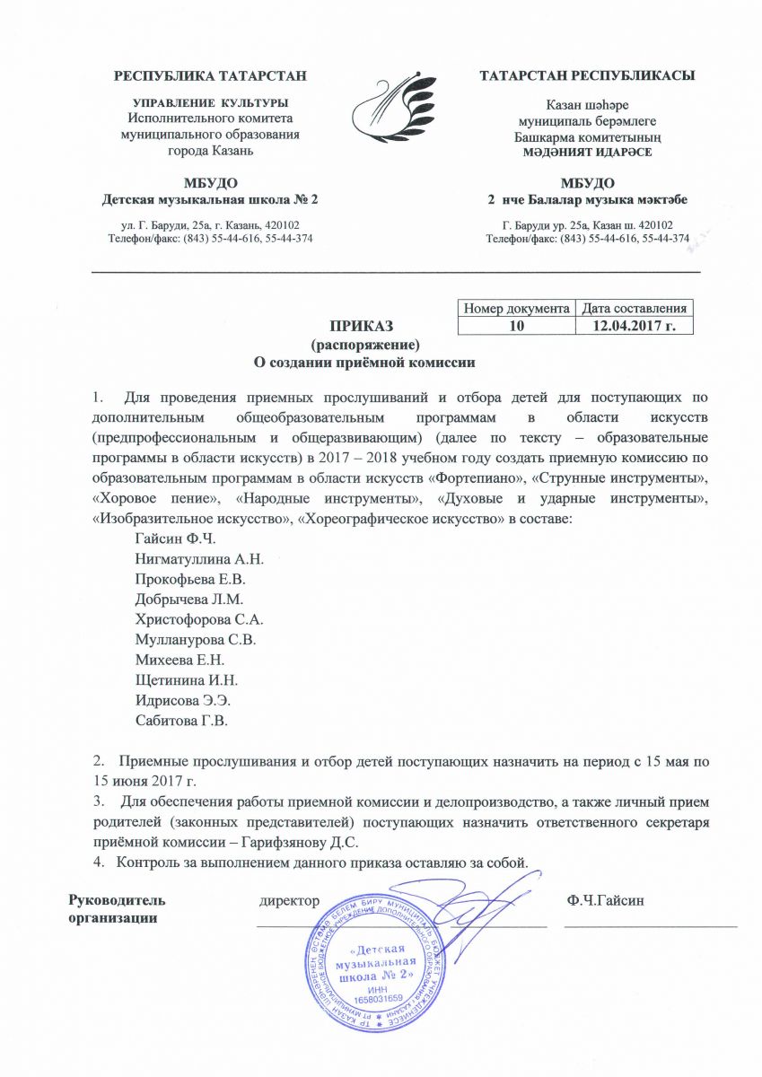 Приказ о создании приемной комиссии