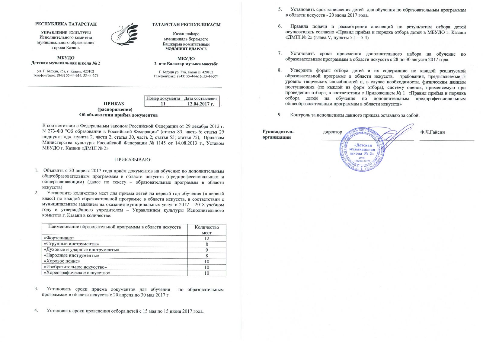 ПРИКАЗ О НАЧАЛЕ ПРИЁМА ДОКУМЕНТОВ