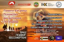 С 31 января по 1 февраля на базе спортивного комплекса «Олимпиец» Казанского училища олимпийского резерва пройдет первенство Приволжского федерального округа по греко-римской борьбе среди юниоров до 21 года, посвященные памяти 6-й роты Псковских десантников 76 Гвардейской десантно-штурмовой дивизии.