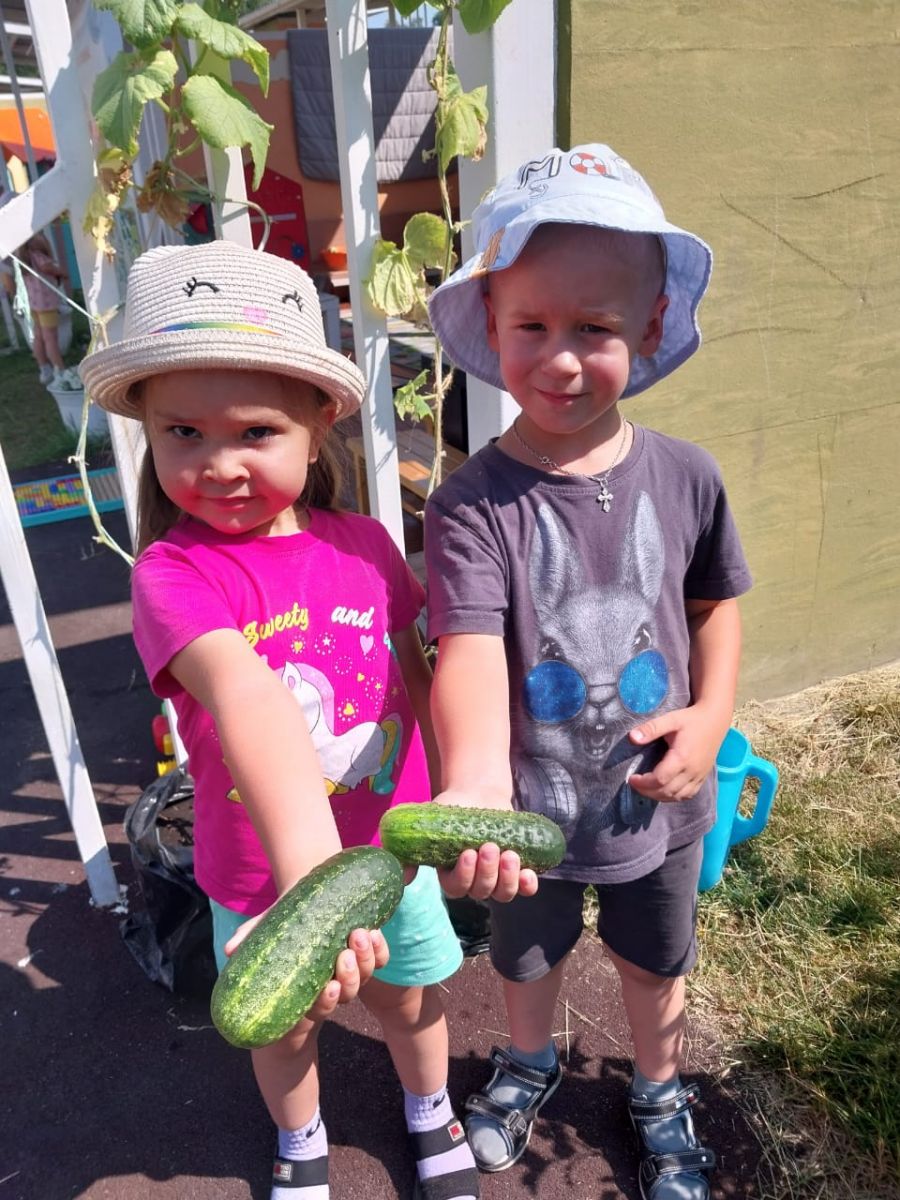 Воспитанники группы №2 вырастили у себя на участке огурцы,воспитатель рассказала о полезных свойствах огурца, вспомнили потешку «Огуречик, огуречик…», играли в подвижные игры «Найди огурец», «Собери огурчики в корзинку». Ребята узнали о пользе огурца для организма, что этот свежий овощ способствует укреплению мышц и костной ткани ребенка. А еще огурцы используют для приготовления салата, солят, маринуют.
