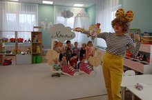 Звонким смехом, громкой музыкой, шутками и прибаутками встретил клоун ребятишек . -