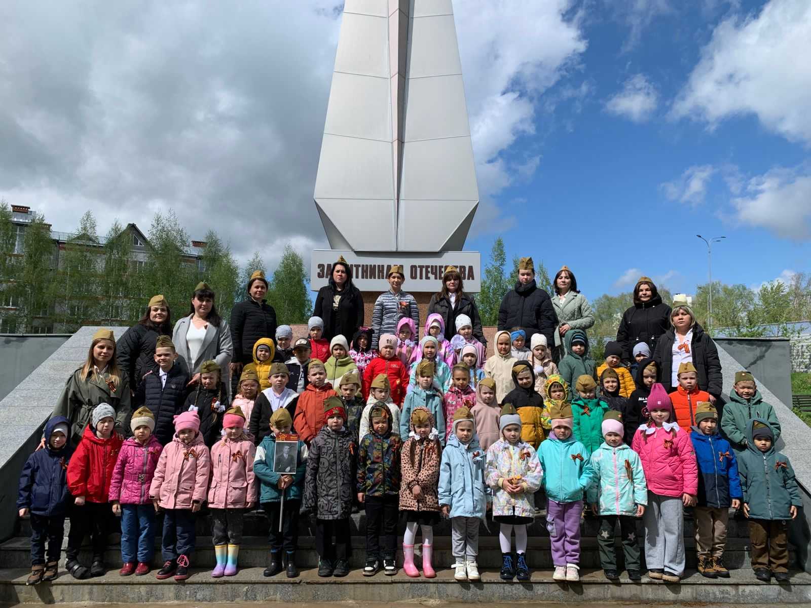 Сегодня воспитанники старших групп возложили цветы у памятника Защитников Отечества в честь 80 летия Великой Победы.