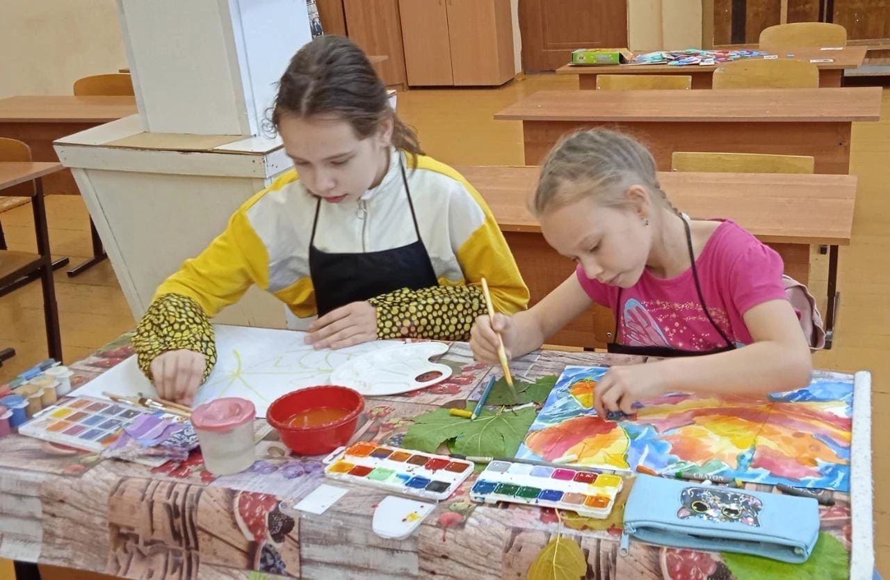 ♦ Объединение «Королева кисточка» изучали новые техники рисования , такие как: восковые мелки, акварель. По теме «Яркие краски осени».