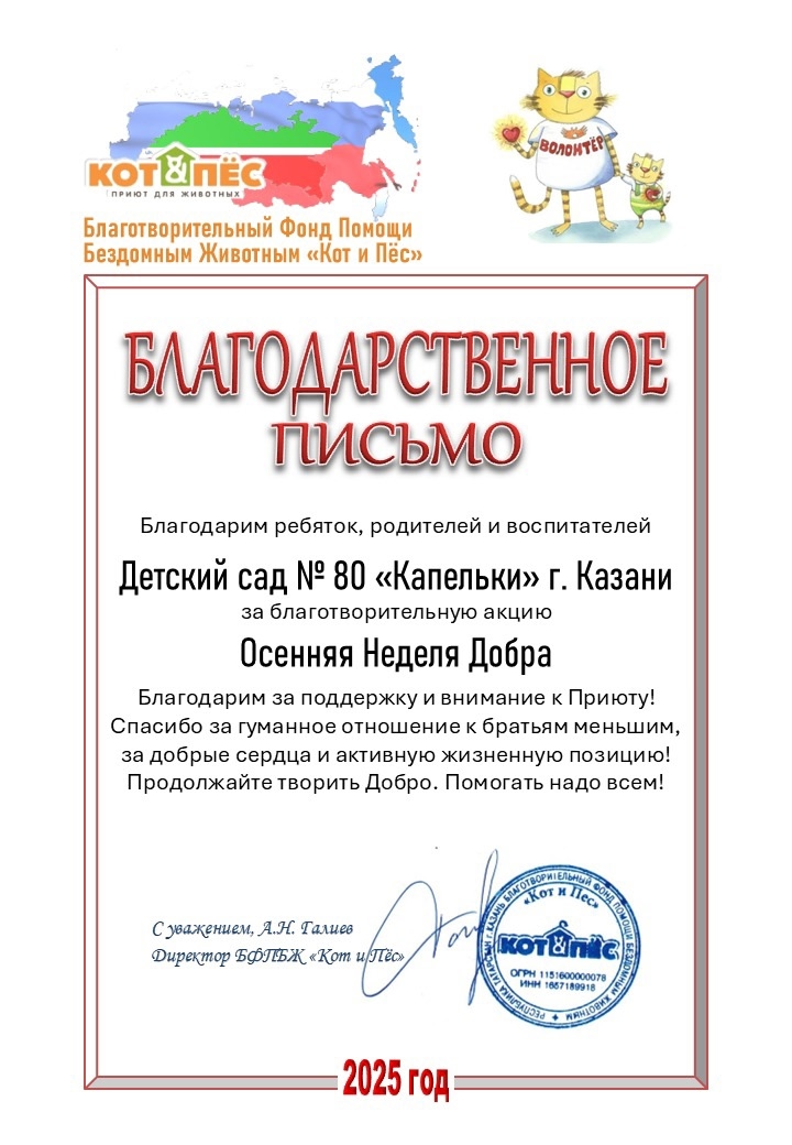 Спасибо Альберту Наилевичу за интересную встречу, а всем родителям и сотрудникам детского сада, принявшим участие в акции по сбору кормов для приюта, спасибо за добрые сердца! -
