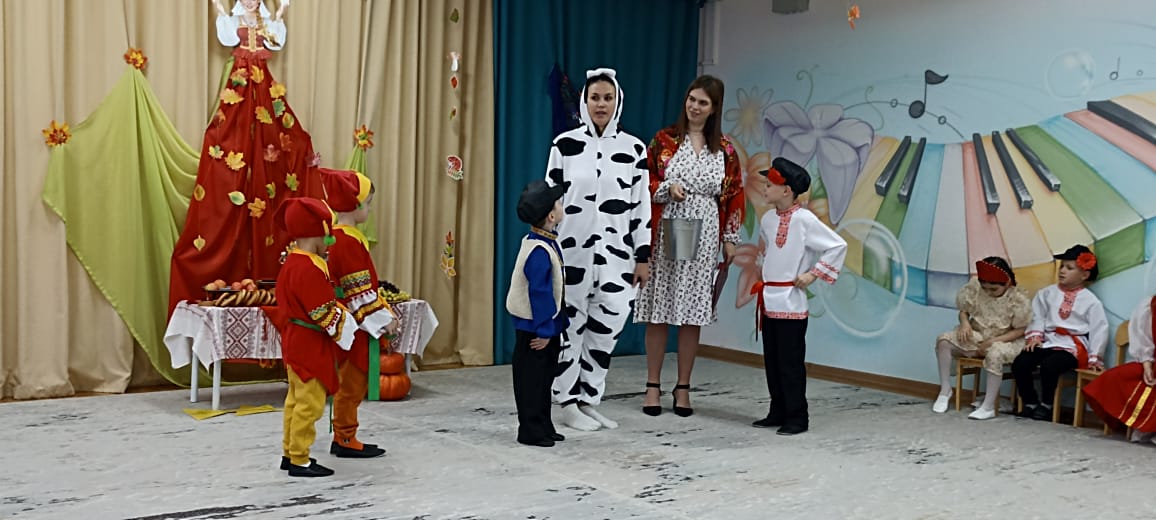 К ребятам в гости приходили различные «герои»: «Осень», «Баба-Яга», «Лисичка», «Зайчик», «Корова», «Арбуз» которым дети помогали, а также вместе веселились и играли.