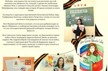 Руководитель проекта учитель английского языка Андреева Надежда СергеевнаАлександра нарисовала портрет участницы Великой Отечественной войны - Веры Порфирьевны Коротиной. По рисунку были напечатаны ОТКРЫТКИ, которые уже отправлены участникам международного сообщества по обмену открытками "Postcrossing"- участникам из России, Греции, Литвы, Тайваня, США и в других странах.