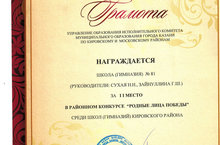 Родные лица Победы. 19.01.2015 Команда школы под руководством Сухой Н.Н и Зайнуллиной Г.Ш заняла 2-ое место в районном конкурсе "Родные лица победы". Команда презентовала работу школьного музея-эвакогоспиталя №3646 и результаты поисковой работы к 70-ию Победы в ВОВ.