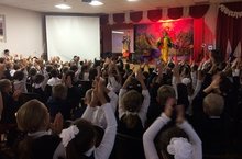 В этот день для обучающихся 1-2 классов на сцене школы прошел интерактивный спектакль «Золотая рыбка», посвящённый правилам дорожного движения. Обучение прошло в игровой форме, дети, по приглашению актёров, охотно поднимались на сцену и включались в игру, становясь попеременно то пешеходами, то грузовичками.